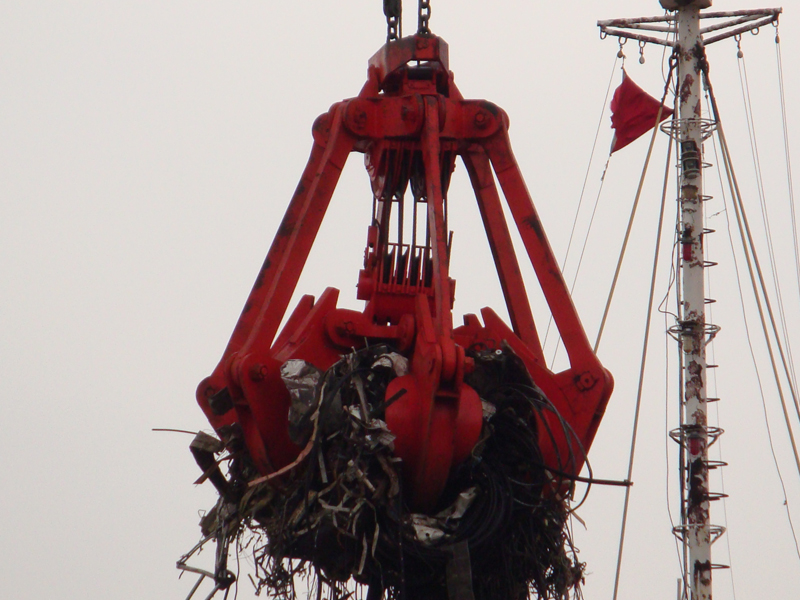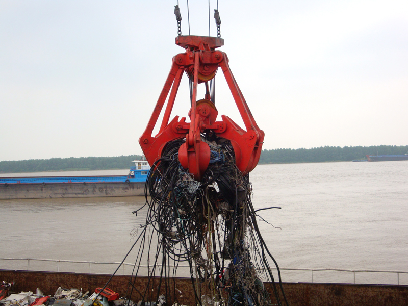 繩索多瓣抓斗分單索、雙索、四索等幾種結(jié)構(gòu)型式。主要用于大塊礦石、廢鋼、垃圾等不規(guī)則散貨物料的裝卸。